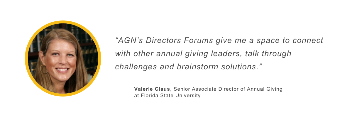 AGN’s Annual Giving Directors Forums bring together leaders and rising professionals from across the industry to explore key issues, share best practices, and strengthen their annual giving strategies. Free to AGN Members, these interactive half-day events combine expert-led discussions with peer-to-peer networking and collaboration. Each forum begins with a keynote presentation on a timely and relevant topic, followed by small group conversations that allow participants to exchange ideas and learn from one another. Attendees leave feeling energized, connected, and better prepared to guide their programs toward long-term success.